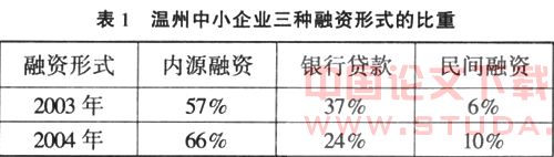 温州市有中小企业7.7万家,其资金来源中,由内源融资、银行贷款、民间借贷三部分构成。根据人民银行温州市中心支行资料整理可知道温州三种融资渠道的比例关系如表1。由表1可见,内源融资是温州中小企业最重要的融资形式,约占60%。银行贷款是最重要的外源融资方式,民间融资是温州民营企业另一个重要的资金来源,近几年民间融资的比重没有下降反而上升了。