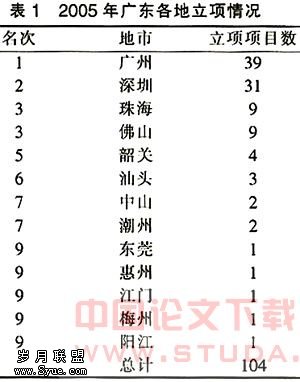 为了解决中小企业,特别是科技型企业融资难的问题,我国各级政府均以财政拨款的方式成立了各种形式的科技发展基金、创新基金、投机基金,其中最有代表性的是由国务院、科技部操作的“中小企业创新基金”,这是一项专门用于培育、扶持和促进科技型中小企业技术创新的政府专项基金。为支持科技型中小企业技术创新、鼓励科技人员创业、加快科技成果转化发挥了积极的作用,并取得了显著的经济效益和社会效益。该基金于1999年启动,资助了8.9亿元人民币的项目,2000年达到11.8亿元。截至2005年,广东省已有500多个项目获得国家创新基金支持,资助金额3.3亿元。2005年广东省共申报项目454项,立项150多项,获国家资助经费超过8000万元,立项数和获得国家资助的经费数均比2004年翻了一番,取得了性的突破。2005年广东省各地区立项排行榜如表1: