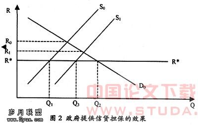 建立信用担保体系是解决中小企业融资困境的重要环节。其作用可以用图2说明。图中R★为正常市场利率水平,R0为中小企业信贷供求均衡利率。由于R0>R★,造成中小企业的信贷缺口为Q1Q2。若政府为中小企业提供信贷担保,将会鼓励银行向被担保的企业提供更多的信贷,供给曲线从SO移到S1,这时中小企业获得的信贷量为Q3,中小企业信贷供求形成了新的均衡利率水平R1。Q3Q2