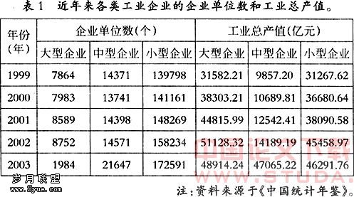 从中我们不难看出,中的中小企业在两项指标上都要优于大型企。首先,在工业总产值上,从1999-2003年,中小型工业企业的总产值之和一直呈递增状态并且始终大于大型工业企业所创造的总产值,又由于工业是GDP增长的中坚力量,可见,中小企业是国民经济的重要增长点,也是推动我国经济持续发展的生力军。