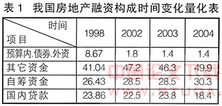 图1和表1为近几年来我国房地产企业融资结构变化图。从图1可以看出,自1998年以来,我国房地产投资来源的最大变化是预算内资金、债券和利用外资的变化,从占年度资金总额的近9%下降到2004年的1.4%,这其中主要原因是利用外资比重的变化,从8.19%下降到了1.3%,显示外资介入我国房地产业的相对规模不但没有上升,反而大幅降低。除这三条渠道之外,在我国房地产投资来源的三个基本部分中,1998一2003年,直接来源于银行贷款的部分事实上一直维持在23%左右,但在2003年央行121号文出台后,各商业银行从严发放房地产贷款,使得2004年银行贷款比重有了较大幅度的下降,减小了5.4个百分点,房地产业自筹资金和其他资金则分别上升1.8和3.6个百分点。