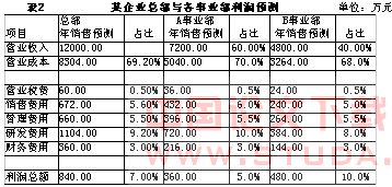 [例2]假设某企业除管理部门和后勤部门外,还有两个事业部A和事业部B,预计公司××年度销售额1.2亿元,预计开支管理费用660万元,财务费用360万元,营业税费60万元。事业部A承担60%销售额,毛利率30%,研发费用占收入的10%,销售费用占6%;事业部B承担40%销售额,毛利率32%,研发费用占收入的8%,销售费用占5%。在进行费用分配时,A、B事业部产生的研发费用和销售费用,按比例计算后直接列示,总部产生的管理费用、财务费用和营业税费按事业部收入的比例分配后列示(计算结果见表2)。