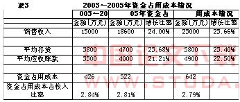 [例3]假设某企业存货由2003年末平均占用额的3800万元上升到2005年末的5800万元,上升了52.63%;应收账款由2003年末平均占用额的3300万元上升到2005年末的4900万元,上升了48.48%;资金占用成本按银行贷款利率6%。显然,从绝对值看,公司资金占用成本从426万元增加到642万元,但同时我们也应看到,其主营业务收入也由2003年度的1.5亿元上升到2005年度的2.3亿元,上升了53.33%。相对于营业收入的增长而言,相对值是减少的了,由2.84%降低到2.79%,其实际资金占用成本是减少了(详见表3)。