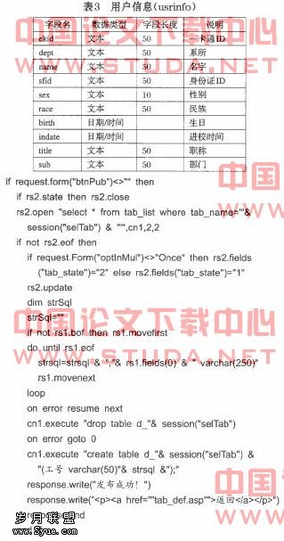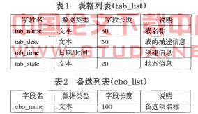 本系统涉及的数据表有3个,其中表l(tab_list)用于记录表格的变动,表2(cbo_list)用于记录备选项目的变动,表3(usrinfo)用于储存用户的各类信息,包括绑定项目。三个表的字段设定情况见表1、表2、表3。动态的数据表项目有三类,以c一开头的表示各种备选项目,用于用户录入表格时直接从组合框中选择填写,管理员对此进行变更维护;以L开头的表示各种管理员设计出来的表格模板,其中包含该表格各列的定义信息,适应不同的应用情况;d_开头的表示相对应的动态表格的具体存储数据,普通用户一旦填写提交后,所提交的数据即存储在以d_开头的,后缀和以L开头后缀相同的表格中,管理员可下载、打印输出相应数据。
