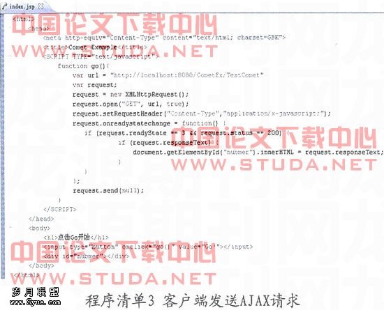 第五,编写客户端。在客户端,发出AJAX请求。请求和常规请求差不多。程序清单3测试了最基本的AJAX请求,它基于XMLHttpRequest,能够很好地响应来自Comet服务器的事件。客户端在readystate为3时(数据仍在传输中)读取数据,从而无须关闭连接,就能读取处理服务器端返回的数据,将它显示在浏览器上。