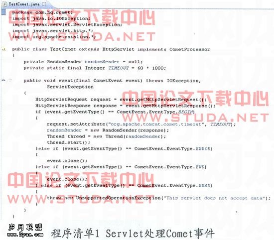第四,编写Servlet。通过servlet实现CometProcessor接口。这个接口要求实现event()方法,在配置的Http11NioProtocol调用event()方法来处理请求,而不是doGet或doPost。最基本的支持Comet的servlet实现如程序清单1所示。