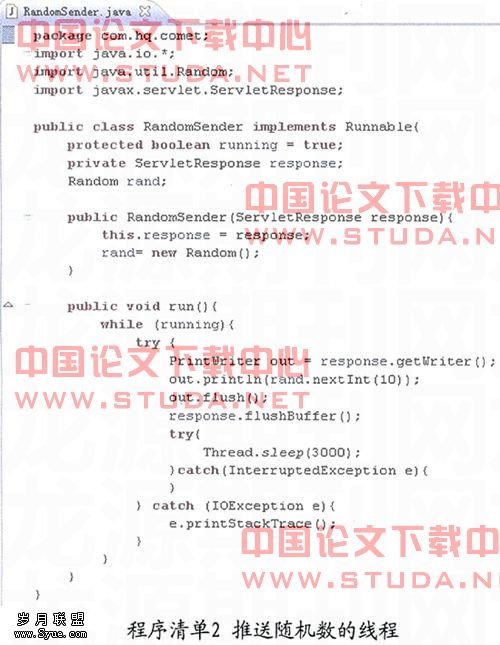 摘要:Comet技术通过实现服务器推(server push)来解决AJAX需要定时频繁发送请求的问题,从而给Web实时系统带来了全新的交互性。本文分析了Comet技术的两种实现方式:长轮询方式(long-polling)和流方式(streaming),并通过一个服务器推送随即数的实例,展示了使用Comet技术开发Java Web实时系统的开发方法和步骤。