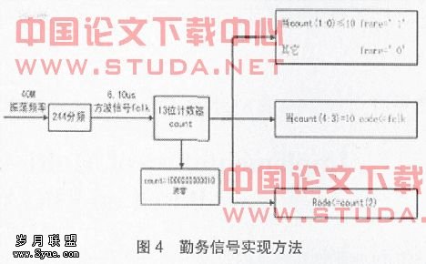 勤务信号分为帧同步信号、路同步信号、码同步信号,上电后自动循环发出,用于数字量变换器数据的采集和传输,并且路同步信号作为计算机字移位脉冲信号。帧同步信号脉宽12.207 us,频率为40 Hz。路同步信号频率为20.48 KHz,占空比为50%。码同步信号频率为163.84 KHz,占空比为50%。帧、路、码同步信号在FPGA内具体实现方法见图4。