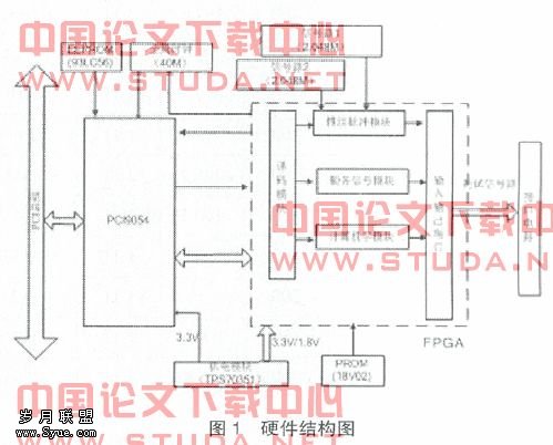 FPGA具有小批量,低投入,高性能,高密度,开发周期短等诸多优点,使国内更多的工程师们乐于采用。由于不需要任何投片费用,也不需要建立任何生产线,因此,采用FPGA所需的投资远远低于ASIC的投资。据估计,引进一套先进的FPGA自顶向下设计工具所需费用还不到ASIC所需的1/10,而大力推广先进的FPGA设计方法,既可以降低诸多产业投资成本,也可培养自顶向下的设计人才,从而为将来国内ASIC产业的快速、健康打下坚实的基础[1][2]。硬件结构见图1。