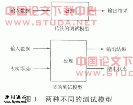 面向对象软件从宏观上来看是各个类之间的相互作用。在面向对象系统中,系统的基本构造模块是封装了的数据和方法的类和对象,而不再是一个个能完成特定功能的功能模块。每个对象有自己的生存周期,有自己的状态。消息是对象之间相互请求或协作的途径,是外界使用对象方法及获取对象状态的唯一方式。对象的功能是在消息的触发下,由对象所属类中定义的方法与相关对象的合作共同完成,且在不同状态下对消息的响应可能完全不同。对象中的数据和方法是一个有机的整体,测试过程中不能仅仅检查输入数据产生的输出结果是否与预期的吻合,还要考虑对象的状态。模块测试的概念已不适用于对象的测试“类测试将是整个测试过程的一个重要步骤,它与传统测试方法的区别可用图1来表示。?
