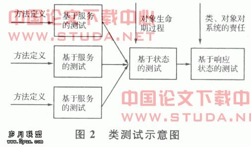 面向对象软件的类测试与传统软件的单元测试相对应,但类包含一组不同的操作,并且某特殊操作可能作为一组不同类的一部分存在。同时,一个对象有它自己的状态和依赖于状态的行为,对象操作既与对象的状态有关,但也可能改变对象的状态。因此,类测试时不能孤立地测试单个操作,要将操作作为类的一部分;同时要把对象与其状态结合起来,进行对象状态行为的测试“类的测试内容分为:(1)基于服务的测试(测试类中的每一个服务);(2)基于状态的测试(考察类的实例在其生命周期各个状态下的情况);(3)基于响应状态的测试(从类和对象的责任出发,以外界向对象发送特定的消息序列的方法来测试对象的各个响应状态)。如图2所示。?