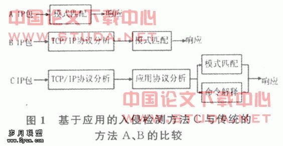 传统的网络入侵检测方法,要么不做任何协议分析(图1中A方法),要么只对TCP/IP进行分析(图1中的B方法)。基于应用的入侵检测方法(图1中的C方法)在进行TCP/IP分析后,还要对应用协议进行分析,并分别取出应用协议数据中的命令部分与数据部分,然后分别对命令进行解释和对应用数据进行模式匹配,从而对入侵检测进行检测。方法A在IP包中利用模式匹配技术盲目匹配攻击特征,很可能会将FTP的攻击特征用来匹配HTTP的包;方法B由于不能理解应用协议,只能将应用协议数据看成没有结构的比特流,进行盲目地匹配。因此,随着模式与待匹配网络包的增加,传统检测方法的效率将呈线性的下降,其时间复杂度为O(n),n为模式和网络包长度的总和;而基于应用的检测系统由于采用基于协议的树形结构来分析检测,随模式的增加,其复杂度仅为O(log2n)。?