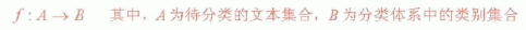 简单地说,文本分类系统的任务是:在给定的分类体系下,根据文本的内容自动地确定文本关联的类别。从数学角度来看,文本分类是一个映射的过程,它将未标明类别的文本映射到已有的类别中,该映射可以是一一映射,也可以是一对多的映射,因为通常一篇文本可以同多个类别相关联。用数学公式表示如下: