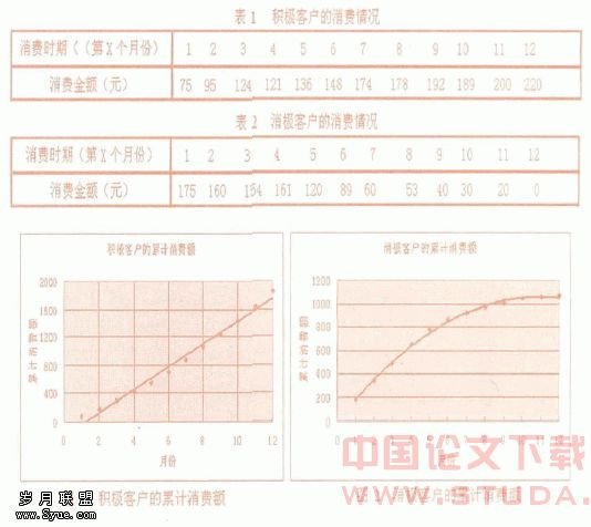 把客户在一段时间内(可按年进行纵向比较,也可按月、季度等进行横向比较)的购买总金额作为参考点,取连续的n个参考点,根据最小二乘法原来对它们做直线拟和。取阈值为0,根据直线性质,如果拟合直线的斜率小于这个阈值,则这个客户在这段时间内对该的购买金额持续减少,并且斜率的绝对值越大,客户的购买金额持续减少的越厉害。反之,若斜率大于这个阈值,则这个客户在这段时间内对该企业的购买金额持续增加,并且斜率越大,客户的购买金额持续增加的越厉害。根据这一分析结果,商场可有效识别异常客户的性质,从而有针对性地进行目标营销——采取有效策略加强与消极客户的沟通,以改善客户对商场的已有认知;继续保持与积极客户的良好关系,以提升其生命周期价值。