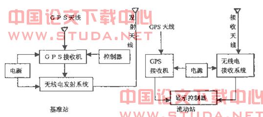GPS(RTK) 系统由基准站、若干个流动站及无线电通讯系统三部分组成。基准站包括GPS 接收机、GPS 天线、无线电通讯发射系统、供GPS 接收机和无线电台使用的电源(汽车用12 伏蓄电瓶) 及基准站控制器等部分。流动站由以下几个部分组成: GPS 接收机、GPS 天线、无线电通讯接听系统、供GPS 接收机和无线电使用的电源及流动站控制器等部分。用框图表示参见图2.1:
