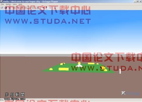 本设计是以虚拟现实技术为基础,应用VRML语言实现的城市环境的模拟,下面是通过编码而得到的一个城市模拟视图图4-1。