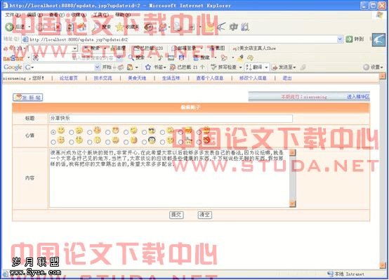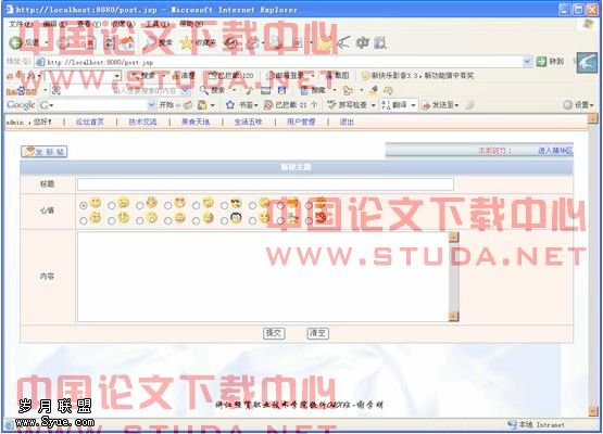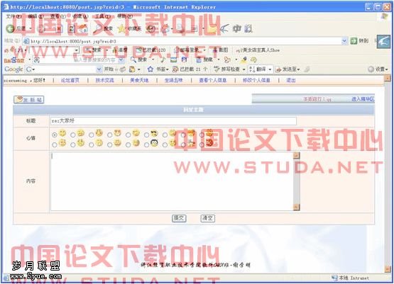 论坛作为一种信息交流的工具,少不了要发表文章,其页面和一般的表单提交差不多,只是增加了一些功能而已。为了用户的方便,在设计时有两个地方可以实现对帖子的发表,一个是在浏览帖子主题列表页面中;另一个是在浏览帖子内容页面中,但这两个所指向的连接是同一个页面。在发表帖子时,将通过JavaBean 取得帖子数量,并保存到数据库中。
