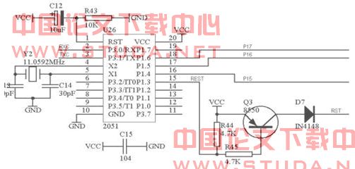 为了实现PC机与单片机之间的串行通信,我们首先要清楚了解整个系统所采用的原理图。原理图就象一根红线贯穿于整个系统设计,通过此图我们就能很清楚的看到系统所涉及的内容,然后鉴于此,我们将在以后的章节中依次对所牵涉的内容作详细的论述。下面对原理图作一点说明:从MAX232芯片中的两路发送接收中任选一路作为接口,要注意其发送与接收引脚对应,否则可能对器件或计算机串口造成永久性损坏。如选他T1IN接单片机的发送端TXD,则PC机、的RS—232的接收端RD一定要对应接T1OUT引脚。同时,R1OUT接单片机的接受端RXD引脚,则PC机的RS—232的发送端TD一定要对应接R1IN引脚。