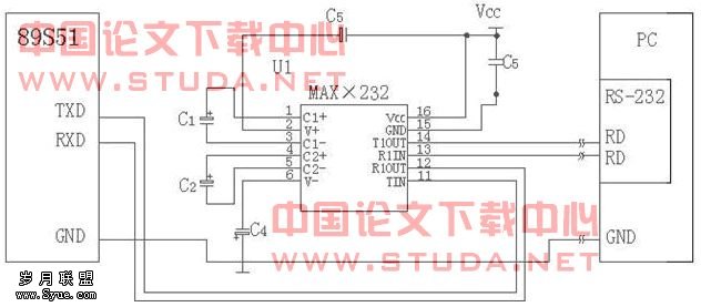 上图为采用MAX232芯片接口的PC机与51单片机串行通信接口原理图
