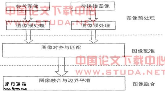 图像拼接技术主要分为三个主要步骤:图像预处理、图像配准、图像融合与边界平滑,图像预处理主要指对图像进行几何畸变校正和噪声点的抑制等,让参考图像和待拼接图像不存在明显的几何畸变。在图像质量不理想的情况下进行图像拼接,如果不经过图像预处理,很容易造成一些误匹配。图像预处理主要是为下一步图像配准做准备,让图像质量能够满足图像配准的要求。图像配准主要指对参考图像和待拼接图像中的匹配信息进行提取,在提取出的信息中寻找最佳的匹配,完成图像间的对齐。图像拼接的成功与否主要是图像的配准。待拼接的图像之间,可能存在平移、旋转、缩放等多种变换或者大面积的同色区域等很难匹配的情况,一个好的图像配准算法应该能够在各种情况下准确找到图像间的对应信息,将图像对齐。图像融合指在完成图像匹配以后,对图像进行缝合,并对缝合的边界进行平滑处理,让缝合过渡。由于任何两幅相邻图像在采集条件上都不可能做到完全相同,因此,对于一些本应该相同的图像特性,如图像的光照特性等,在两幅图像中就不会表现的完全一样。图像拼接缝隙就是从一幅图像的图像区域过渡到另一幅图像的图像区域时,由于图像中的某些相关特性发生了跃变而产生的。图像融合就是为了让图像间的拼接缝隙不明显,拼接更自然