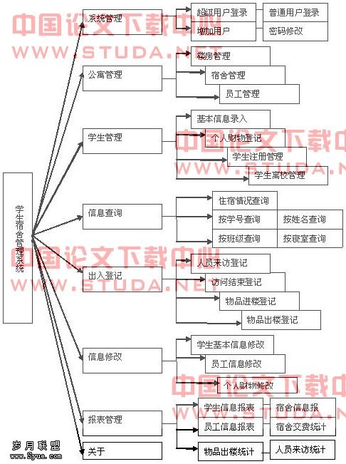 在整体设计中,我们将宿舍管理系统分为八个大的模块:系统管理模块、公寓管理模块、学生管理模块、信息查询模块、出入登记模块、信息修改模块、报表管理模块、关于模块。每个模块将实现不同的功能。下面将具体进行介绍。