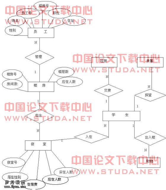 在我所设计的模块中,主要涉及到员工、楼房、寝室这三个实体,所以在E-R图中我只是将这三个实体的属性进行了详细说明。