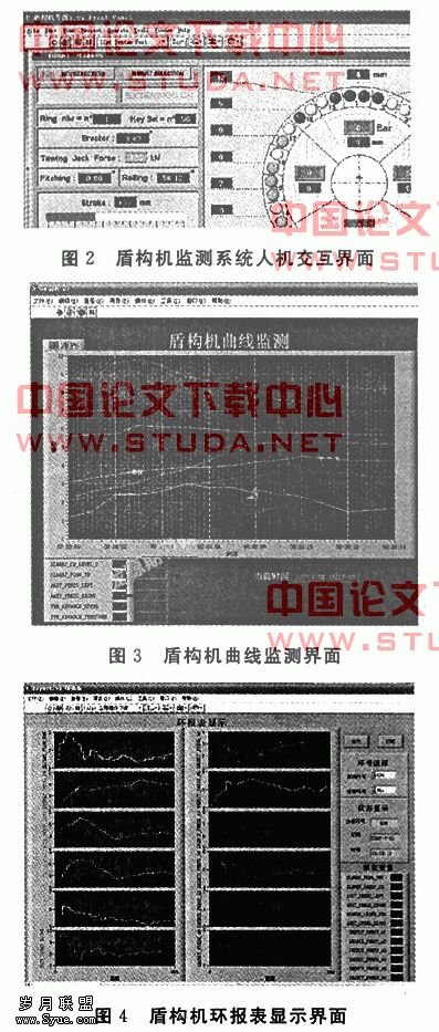 本系统主要有三种数据应用与表示方式:盾构机监测界面显示、监测曲线绘制显示、环报表输出,方便于监测人员从不同的角度来监测盾构机的工作状态。?