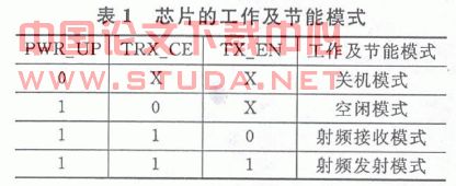 nRF905有两种工作模式和两种节能模式。两种工作模式分别是 接收模式和 发送模式,两种节能模式分别是关 机模式和空闲模式。nRF905的工作模式由TRX_CE、TX_EN和PWR_UP三个引脚决定。详见表1。?