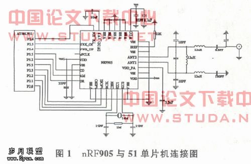 MOSI/MISO是发射/接收数据的通道;TRX_CE,TX_EN是收/发通道的控制端;PWR_UP是工作模式控制端;CSN、SCK为串行接口控制端;CD是接收模式下载波监测信号输出端;AM是接收到正确的数据包地址后芯片指示信号的输出端;DR是发射完一个数据包后芯片指示信号的输出端;uPCLK是芯片提供的一个可设置的时钟源信号输出端;ANT1和ANT2用于天线部分;XC1和XC2外接电路构成了晶体振荡电路。nRF905片内集成了电源管理、晶体振荡器、低噪声放大器、频率合成器、功率放大器、通信协议控制等模块,曼彻斯特编码/解码由片内硬件完成,无需用户对数据进行曼彻斯特编码,因此使用非常方便。可自动处理字头和CRC(循环冗余码校验),使用SPI接口与微控制器通信,配置非常方便。由于nRF905采用抗干扰能力强的高斯频移键控(GFSK)调制方式,抗干扰能力强,能很好的减少噪声环境对系统性能的干扰。?