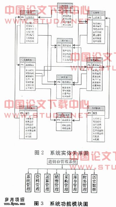 通过前面对系统流程的分析,可以得出系统的数据库的主要数据表中应包含库存表、物资表、客户表、应收款表、应付款表,员绩表。进而可以得出本系统的基本的数据库与数据表之间的关系,这种关系我们可以通过实体关系图(E-R图)来表示,见图2。系统中包含了八个子模块:采购管理、销售管理、库存管理、财务管理、运算管理、数据、资料管理、系统管理。系统功能模块图见图3。?