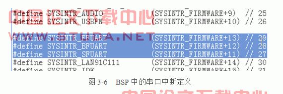 打开C:/WINCE500/Platform/XSBase270/Src/inc/bsp_cfg.h文件。可以看到调试串口和通信串口的中断号的定义,如图3-6所示。