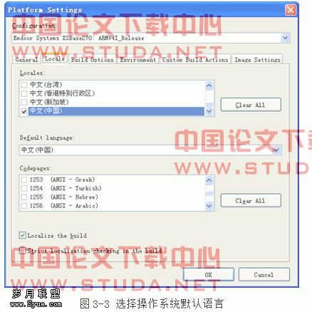 完成特性的添加后,设置平台的属性。在“Platform”菜单下单击“Setting”,在Configuration下拉菜单中选择“Emdoor Systems XSBase270:ARMV4I Release”项,选择Locale选项卡,进行系统地理位置和环境语言支持的设置。Locales列表中,为最下端的“中文()”项打勾。在Default Language下拉菜单里选择“中文(中国)”为系统的默认语言。如图3-3所示。