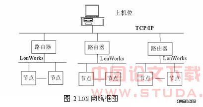 楼宇自动化安防系统选用两级机监控系统,即由上位管理机、LonTalk适配器以及多个智能节点组成,节点数量可根据监控的需要增减,使用LonWorks 现场总线作为控制和通信网络把各节点连接成一个分布式智能控制系统,其网络结构如图2所示。