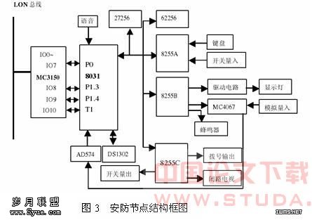 安防节点结构框图如图 3所示,神经元芯片 MC3150 是家庭安防节点的通信控制部分,通过它可以与住宅其它节点进行通信联络,物业管理中心也是通过其向各家庭安防节点传达各种控制命令。图中单片机 8031 是安防节点的中心控制部分,整个单片机及其它与其相连的设备一起作为神经元芯片的输入输出设备,其实这一部分也具有相对立的功能:如果神经元芯片与 LonWorks 总线断开时,那么整个安防节点仍具有防盗报警等功能,这时的控制完全由 8031来完成。所以该系统的可扩展升级性很强,能满足不同用户的需求。图中的开关量输入/输出及模拟量输入/输出用来采集各种报警信号和完成 8031 下达的控制命令。