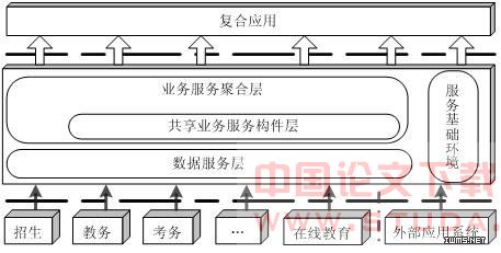依据现有的SOA参考架构,我们提出了基于SOA的远程开放教育信息系统参考架构,如图1所示。该架构分为数据服务层、业务服务聚合层和复合应用层,并由服务基础环境支持系统的运行。