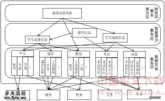 业务数据模型可从数据实体服务层、服务聚合层、跨组织服务聚合层三个层次进行描述,这三个层次是从具体的组织内数据实体视图到虚拟化的、面向用户的跨组织数据视图进行区分的: 数据实体服务层:为系统提供数据实体的统一视图,并将数据都封装成为定义简单的、原子的数据实体服务模型。 在不同的业务系统中,数据以不同形式存在,使用不同的标准进行建模和编码,对整个系统来说,数据实体有全局的,有局部的,有原子的,有组合的。因此,在数据实体服务层,要重新建立一个全新的、统一的、集成的数据模型,重新定义新的关联和数据结构,对数据实体的描述也要进行扩充,除了其本身的固有的属性,还应包括每个数据实体的位置、来源、用处、限制和数据存储模型,以及对这些数据实体服务的描述,当然,这些数据服务仅仅是对数据实体的一些简单操作。在分析抽象时数据实体时要从整个系统的高度去看,而不是从某个业务领域去看,主要使用自顶向下的分析建模方法,要按照数据实体的不同功能和来源进行分类和分层,分析抽象出最原子、最底层的数据实体,对每一种数据实体要描述清楚其局部模式和全局模式之间的映射关系。新的数据模型将以全新的体系结构图开始,是系统内所有数据实体从各个角度的描述,是对数据实体服务的描述。数据实体服务层向上发布其元数据信息,提供的是较低层的、细粒度的数据服务。 数据聚合服务层:基于数据实体服务层,按照某个部门或特定业务领域制定的某种聚合策略,建立聚合服务模型。 每个聚合服务对应唯一的一种聚合策略,有唯一的全局标示。对每个聚合服务的描述,包括其标识、种类、功能、聚合策略和该聚合服务向下层服务的映射和转换模式,也包括对服务接口的定义。每种聚合服务可以对应到任意多个数据实体服务的组合,也可以对应到数据实体服务和底层聚合服务的混合组合,也可以是多个子聚合服务的再组合。当聚合服务被调用时,聚合服务模型把服务调用映射、转换到各数据实体服务或底层子聚合服务,生成服务的实例,并与这些服务进行交互。聚合服务是进行整个企业内跨部门、跨系统数据集合的最小单位。 跨组织服务聚合层:基于数据实体服务层和聚合服务层,建立一个逻辑模型,主要用于解决跨组织提供信息的统一视图问题。 这一层要建立的模型不是一个固定的全局模型,而是一个动态可扩展逻辑模型,把下层提供的数据实体服务和数据聚合服务映射到该逻辑模型中。需要注意的是在映射过程中,要保证聚合服务在跨组织时的名字、结构、语义、并行等的透明性。跨组织聚合层在引用下层的聚合服务时,还要考虑它们的各方面的属性,尤其是非功能属性,如选取不同组织提供的相同服务时要考虑各组织所提供服务的QoS属性。当然,跨组织服务聚合层也可以直接调用数据实体服务。 在这三层描述中,前两层侧重于业务数据的建模,最后一层侧重于业务逻辑的抽象和建模。下面以一个简单的例子进行说明,如图2所示: 学生、课程、教师、、试卷等是从远程开放教育信息系统中抽象的部分数据实体,这些实体是从整个信息系统的高度来抽象地,其属性可能来源于多个不同的部门,在数据实体服务层描述它们;学生选课信息、学生报考信息和学生成绩信息是按一定业务规则聚合的服务,属于数据聚合服务层;教师业绩考核信息是一个跨部门的高层聚合服务,它根据动态的业务要求聚合下层服务,属于跨组织服务聚合层。 上面是对业务数据模型分三个层次的描述,而在分析和建立数据模型的过程中将分为三个阶段进行: 第一阶段:用传统的E-R分析方法建立业务数据的实体关系模型,分部门、分组织找出分析并找出所有数据实体,然后借鉴数据仓库按主题存储的思想,从整个系统的高度对数据实体再进行综合的处理,使得数据实体仅包含最基本的业务属性,并消除冗余和重复。 第二阶段:借鉴数据仓库多维数据模型的结构,使用UML建模方法对数据实体进行分组、分层的设计和组合,把数据实体转换为具有简单操作的数据对象。 第三阶段:根据已经建立好的数据对象业务模型,定义完善的格式标记和服务机制,对数据对象进行扩充和包装,选取适当的模式,使用标准的XMLAPI和工具包进行数据的转换和服务的设计、封装,将数据对象最终转换为服务数据对象;结合SOA的消息服务和基层服务组件,完成服务的提供、接受和发布、管理。 当然,在这过程中,要保证数据模型的一致性和完整性;同时,在服务的多层组合和封装中要控制服务到适当粒度,使提供的信息尽量充足而不冗余,缩短服务执行的时间,提高服务品质。