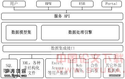 数据集成接口:屏蔽底层数据源,向上提供统一标准格式的数据。一般采用API来实现,可直接访问各种源数据库及其元数据,也可访问其它数据源,包括应用系统API、用户数据、Web服务数据及其它外部的各种数据源;同时完成XML标准格式到不同数据之间的数据转换和数据映射。 数据模型集:以一致、标准和统一的格式描述业务数据模型,一般是以XML模型的方式建立业务数据模型,并进行模型的管理和监控,可以对模型进行修改、添加和删除。 数据处理引擎;按照上层具体应用要求,从业务数据模型生成数据服务实例;完成服务调用和响应。主要负责两方面的工作:一是解释数据模型和服务调用,完成各层模型的转换和映射;二是从服务调用和响应消息中抽取业务数据,完成数据操作和,并把结果以标准格式写入响应消息。 服务API: 按照系统业务功能,划分基于标准的服务接口,接受外部服务调用请求,将请求信息进行转换后发送给数据处理引擎,同时把调用请求映射到一个业务数据模型。快速构成服务组件,适应业务流程需求的变化。 首先,用户按照预先定义的业务解决方案,通过服务API提供的服务列表找到相应的服务接口,该服务接口把用户请求定位到数据模型集中定义标准服务的业务数据模型,生成服务实例;通过数据处理引擎,按照模型中对服务的定义和已设定的业务规则,组合这些服务实例,调用数据集成接口层的数据,形成一个完整的业务流过程。根据此业务数据服务模型,一个外部应用可以驱动一个复杂的业务流程,例如,学生选课这个业务流程,它由创建学生信息,发现课程信息和创建选课等服务组成。