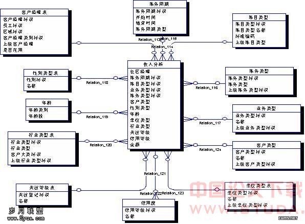 在电信经营分析多维数据模型设计中,我们主要采用星型模型进行建模,提高查询效率以及降低建立CUBE所需时间。 电信企业经营分析系统数据仓库划分的主题主要有:客户主题、帐务主题、帐户主题、收入支出主题、服务及使用主题、计划主题、资产及设备主题等。 对每个主题域建一个数据集市,采用星形结构。建立的主要分析模型有:财务收入分析,分析维度有:时间,区域,帐目类型,产品等,分析指标有:财务收入,用户数等;业务收入分析,分析维度有:时间,区域,帐目类型,产品等,分析指标有:业务收入,用户数等;收入结构分析,分析维度有:时间,部门,帐目类型,产品等,分析指标有:财务收入等;业务支出分析,分析维度有:时间,帐目类型,产品,部门等,分析指标有:业务支出等;客户情况分析,维度信息是:时间、地域、年龄组、客户性别、消费层次、客户类型、客户职业、信用等级、呼叫时长层次、呼叫次数层次、在网时间等级、业务品牌、业务种类。指标值是按维度适当汇总的:客户总数、活动客户数、欠费客户数、零次客户数、新增客户数、流失客户数等;业务分析,维度信息是:时间、地域、客户性别、客户年龄组、客户类型、客户职业、消费层次、业务品牌、业务种类、通话时段、呼叫类型。与维度相关的指标:通信时长、通信次数、通信量、MOU、新业务使用量等;收益情况分析,模型的维度信息是:日期、地域、客户性别、消费层次、客户类型、客户职业、信用等级、业务类别、费用类别。与维度相关的指标:收入总量、收入增量、ARPU、欠费金额等。以及设备使用情况分析;固定资产利用情况分析;效益与核算分析等;基于篇幅关系,图2仅给出收入分析模型图。