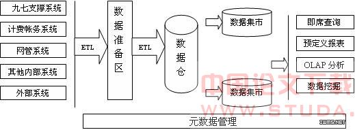 从各业务系统、非业务系统中将相关业务数据进行抽取、清洗、加工、整理、加载到数据仓库中,在数据仓库中形成基础的分析数据的存储,然后根据业务及管理等实际的需要在数据仓库上建立适合各种应用的数据集市。数据仓库、数据集市中蕴含的信息可以通过报表、OLAP分析、即席查询等形式向综合营销系统使用人员展现。系统体系结构分为三层,即数据获取层(数据准备区)、数据存储层(数据仓库及数据集市)和数据展现层(报表、分析等),如图1所示: