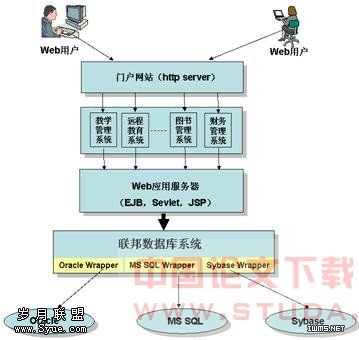 在此联邦 DBMS 服务器和web应用服务器体系结构中,web应用服务器通过JDBC 应用程序连接到联邦 DB2 服务器,该联邦数据库服务器被配置成访问位于不同平台上的多个数据源。这使得 JDBC 应用程序能够透明地使用任何或所有这些数据源。应用层基于应用支撑层提供的业务视图实现综合应用,应用层无须考虑底层异构信息源的复杂性,仅需专注于应用的流程和展现。门户层以校园门户网站做为与用户交互的平台。