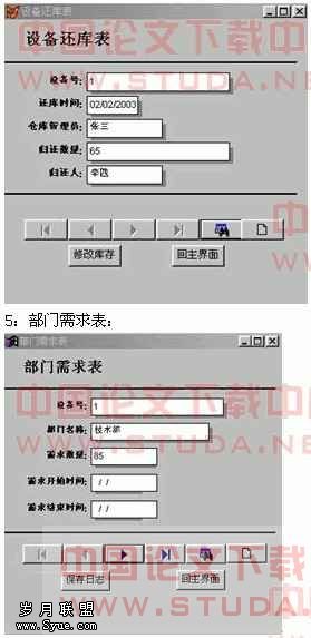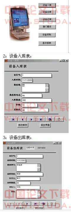 在设备需求模块中将实现设备需求数据的添加和保存日志等功能。首先通过Visual Foxpro的表单向导生成所需的设备需求表单,选择部门需求表的所有可用字段,然后为保持程序风格的一致,继续采用表单的阴影式和图片按钮的风格。在“步骤3-排序次序”时。选择设备号的升序排列。最后单击“完成”按钮,把表单保存在“c:仓库管理”目录下,名为“设备需求.scx”。