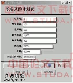 通过Visual Foxpro的表单向导,生成设备采购计划表单。在选择数据库和表时,选择仓库管理数据库和设备采购计划表。在选择字段时,选择所有可用字段,选择阴影式和图片按钮作为设备采购计划表的样式。选择计划采购时间的升序排列作为设备采购计划表的索引。