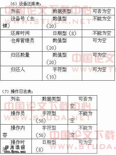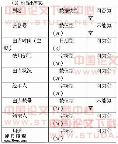 ● 设备使用信息。包括的数据项有使用的设备、使用部门、数目、使用时间、出库时状态。