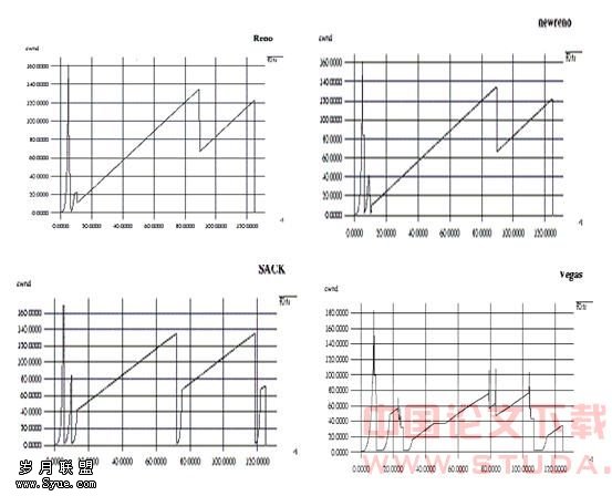 图1 拥塞控制算法仿真实验图1是在NS仿真平台下,对各拥塞控制算法进行的仿真实验,通过追踪数据得到的各时刻的cwnd变化情况。