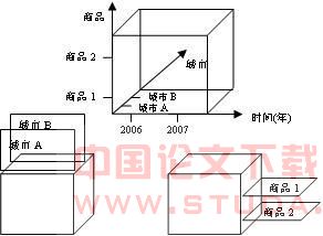 在分析销售数据时,从不同角度审视销售的衡量数值是一种很的思考模式。根据用户所选择的分析角度,事先好一些辅助结构,以及每一维不同层次重要衡量的总计,以便在查询时能够尽快抽取到所需记录,并快速地从一维转变到另一维。这样用户就可以在短时间内从各种不同的角度审视销售的状况,不但提高了决策的正确性,而且缩短了做出决定所需要的时间。在本例中,使用两种主要多维分析技术:向下钻取、旋转和切片。前者用来查看某一具体数据维中的更详细的数据,后者用来从不同角度或不同层次得到聚合数据。 1)切片(Slice)和切块(Dice) 在多维数据结构中,按二维进行切片,按三维进行切块,可得到所需要的数据。如在“城市、产品、时间”三维立方体中进行切块和切片,可得到各城市、各产品的销售情况。