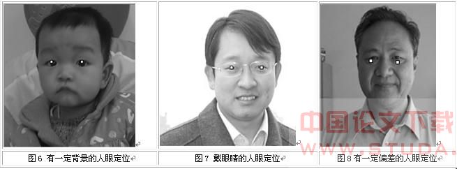 实验中对不同光照、不同姿态、不同背景的人脸图像进行测试,实验表明该方法对具有一定背景、戴眼睛的人脸基本能够定位,参见图6至图8。在某种情况下可能会出现人眼定位的偏差,主要原因是将眼睑部分也视为可能的眼睛块处理。