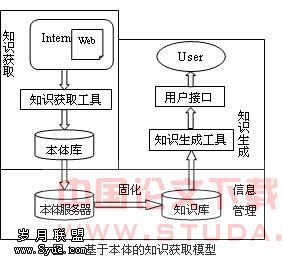 基于本体的知识获取模型包括知识获取、信息管理、和知识生成3大部分。其中知识获取工具利用搜索引擎技术从Web文档中一点一点地收集信息项(如句子和段落)。知识获取工具将所获得的信息片断和本体字典库中的元数据一起传送到本体服务器中,本体服务器存储并固化这些信息到知识库以备知识生成工具访问,当用户请求查询某条相关信息时,知识生成工具从知识库中获取信息并生成知识叙述通过用户接口返回信息给用户。其结构如图1所示。