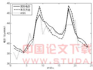 本文采用北欧电力交易市场公布的07.10.29至08.2.10期间的电价数据对网络进行训练,并预测08.2.11至08.2.17各时段的电价。11日的电价预测曲线如图4所示。