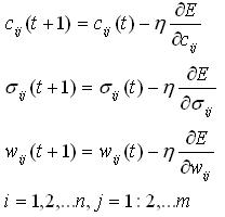 和w可采用误差反向传播算法进行调整,其目标函数选为: