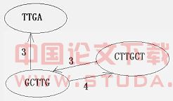 目前,对于一个典型的较小规模测序问题,处理过程可粗略地分为两步:首先用“散弹枪”法将目标分子打散,然后将打散的片段重新拼接起来。 经过实验处理后获得的片段数量多在1000-2000左右,目标分子的长度也仅为30,000bp-100,000bp。 因而将每一个片段作为图的一个顶点,构造一个完全图进行处理是合理的。目前通常的做法是将所有结点即片段两两通过局部比对,除去嵌合片及重复片段,然后采用诸如最短公超串(SCS)、重构(reconstruction)、多连叠(multicontig)等模型来构造片段排列,计算表决,如由X.Huang提出的方法[3]就是这样。 其中,针对SCS模型又有若干种算法,这些算法的传统目标多为寻找Hamilton最大权路径,这可以采用递归搜索策略,但可能需要花费指数时间[5]; 也可以采用贪心搜索策略[6], 其时间复杂度为Ο(n2),这个是目前其他各种算法的基础。对于贪心搜索策略主要有以下两个问题,第一:由于Hamilton难题是NP完全的,故贪心算法并不总是返回最短超串的[1]如图1所示,权为4的边是第一个被考察的,从而另两条权为3的边被丢弃;第二:不适应实际情况,为了解决目标序列上的覆盖缺乏问题,通常会增加随机采样,造成所有片段长度的总和大于目标序列的7-8倍以上,而Hamilton路径将所有节点都加入,这不符合实际。